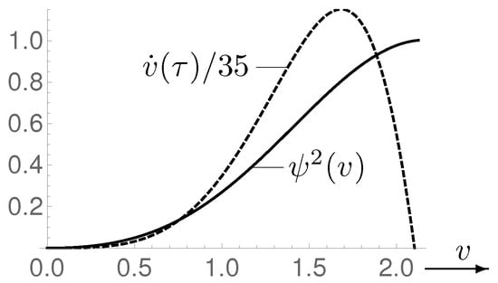 - Interpretation. Contributions to the literature on QG such as [,,] give the impression that too little information is available for the assignment and interpretation of the WdW-equation. In Ref. [], the interesting suggestion is made to use the de Broglie–Bohm interpretation for this purpose. According to this, from the representation of the wave function, particle trajectories satisfying are derived. Unfortunately, this is not possible in our case because the solutions of Equation (14) are real whence . Therefore, we develop an alternative, which, like the de Broglie–Bohm approach, leaves quantum mechanics completely unchanged and concerns only its interpretation. Under application to the solutions of Equation (14), it consists essentially in reversing the step that leads from the classical to the quantum-mechanical description. Specifically, for the spatial density of the quantum mechanical momentum, we make the ansatz( is obtained from Equations (A2)–(A4)) by which it is identified with the classical momentum. The multiplication of the left side by i constitutes the return to classical values and can be interpreted as reverse Wick rotation. With Equations (4), , , and going over to dimensionless quantities, and resolving with respect to , the last equation becomesThis means that the DM moves to larger values of until it terminates the entry process, if everywhere . The velocity and , up to a normalization factor the probability density of our “soft entry” solution, are depicted in Figure 2. From that, it becomes particularly clear that our solution is suitable for describing a creation from nothing. Regarding the dynamics, one could even say, at least for this solution that in the QR the role of time is taken over by the probability density .