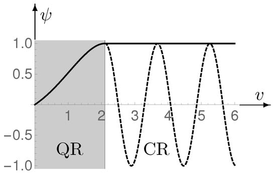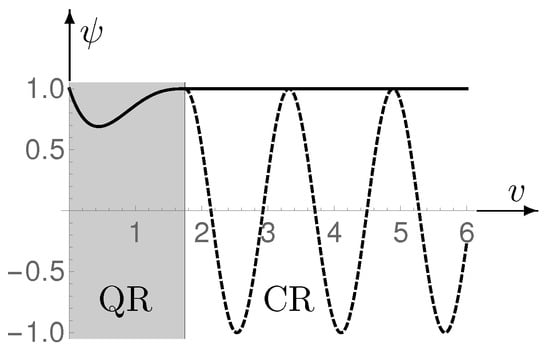 Figure 3. The full curve is a joint representation of the “soft entry” solution for the QR (gray filling) and for the CR. The dashed curve shows once again, but highly compressed in the horizontal direction in order to visualize the oscillations. - Normalization of and corresponding probabilities. The freely selectable factor C in the solutions of Equations (14) and (20) allows a particularly simple fulfillment of the normalization condition (A11), for which onlymust be chosen. The normalized solution is then . This does not only apply to the solution for the QR, but also to combined solutions for the QR and the CR. For comparing states that have been traversed up to a certain time (corresponding volume ), it appears reasonable to extend the normalization range from up to . Over time, the upper boundary becomes larger and larger, with the result that the probability density of fixed and duly normalized intermediate states becomes ever smaller. Therefore, it is obviously useless to compare intermediate states of different normalization. In other words, it only makes sense to compare states with the same normalization, which amounts to determining the ratio of their probabilities. However, this is just as well obtained from a wave function without normalization, which is valid for the entire range. (This is the reason why our figures are not based on normalized wave functions.)For interpreting the dynamics of the system described by the wave function (21), the probability density can not be used as in the case of the “soft entry” solution. The reason is that it has many local maxima, and the system would remain with one of them, once it has reached it. This problem can be solved by considering the set of values between two successive zeros as a single quantum state of the classical system. This range has the size following from or and corresponds to the x-range orwhere Bohr radius. Regarding the dynamics, we assume that the system jumps from one state to the next in leaps of the length . In this interpretation, up to an uninteresting factor, the probability density of the various system states is given by the average of the local density over a half period, that is, byWith our solution, the probability of the different states does not decrease as with the solution (19) based on the usual minisuperspace. However, it does not increase as desired either. This can, however, be improved by taking advantage of the fact that the classical dynamic is an evolution in time, and by relating the probability density not to volume but to time (using instead of ). Settingfor we employ the classical solution: from and use of Equation (9), we get and finallywhere v does the jumps of height described above. Plotted above v, thus follows a staircase-like curve of the slope . Once again, the incremental probability of the individual quantum states can be considered as a substitute for time.