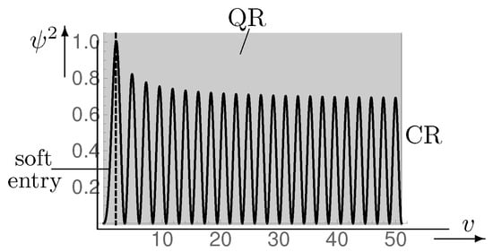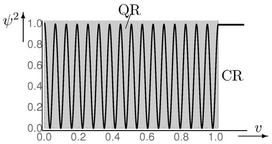 allows such solutions. (In order to stay within the scope of valid physics, one would have to assume that the information concerned is not bound to matter. Otherwise, Bronstein’s black hole argument would be violated, according to which anything smaller than is “hidden inside its own mini black hole”, see pages 7–8 of Ref. []). A corresponding solution for the HH-like case with and, once again, is shown in Figure 5. (The discontinuous transition from short to extremely long waves is due to the fact that, in the transition from the QR to the CR, jumps from zero to , see Equation (10); it could be remedied by prescribing a continuous transition of .) Like the solution for the CR, it contains many zeros of , if . As for the CR-solution, we interpret the regions between neighboring zeros as single states. Except for those with small v, the distance between adjacent zeros is pretty much or , which can be derived from Equation (30): for , the latter reduces to