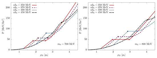 In Figure 1, we show the calculated zero-temperature equations of state in the mean-field approximation with MeV (Figure 1, left) and MeV (Figure 1, right), for different values of the parameter, namely MeV (red, solid line), MeV (purple, dashed line), MeV (blue, dotted line) and MeV (black, dash-dotted line). The value denotes the vacuum expectation value of the b-field. The coexistence phases of the chirally broken and restored phases are shown between circles. We stress that the chiral and deconfinement phase transitions are sequential in the current model setup (see [16]). The latter happen at higher densities and are not shown in the figure.