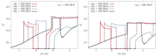 In Figure 3 (left), the three curves for MeV consist of three phases: the chirally broken phase in the low-mass part of the sequence, the chirally restored phase in the high-mass part, and the coexistence phase between filled circles. Similar to the equation of state, increasing the value of softens the chiral transition, which eventually becomes a smooth crossover for MeV and consists only of branches with chiral symmetry being broken and restored, separated by a circle.