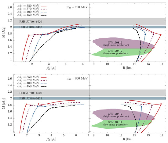 In general, there is one-to-one correspondence between an EoS and the mass–radius relation calculated with it. In Figure 3 (left), we show the relationship of mass vs. central net-baryon number density, for the calculated sequences of compact stars, together with the state-of-the-art constraints on the maximum mass for the pulsar PSR J0348-0432 [32] and PSR J0740+6620 [8]. We point out that the chiral phase transition leads to a softening of the EoS so that it is accompanied by a rapid flattening of the sequence. Notably, the chiral transition for all values of occurs in the high-mass part of the sequence, but below the constraint, at around .