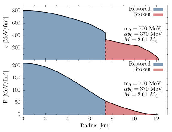 Profiles of the energy density (top) and pressure (bottom) for a neutron star with for MeV and MeV. The red regions show the phase, where the chiral symmetry is broken, in the blue regions chiral symmetry is restored. The phases are separated with the dashed lines.