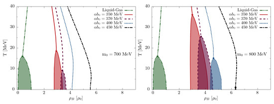 The observational neutron-star data provide useful constraints on the structure of strongly interacting matter. Furthermore, they may constrain the phase diagram of isospin-symmetric QCD matter, which is of major relevance for the heavy-ion physics. In Figure 5, we show the low-temperature part of the isospin-symmetric phase diagram obtained in the model in the -plane for MeV (Figure 5, left) and MeV (Figure 5, right). The liquid–gas phase transition (green, dashed-doubly-dotted line) is common for both values of by construction of the hybrid QMN model [15,16]. Its critical point shows up at around MeV, above which it turns into crossover. A similar phase structure is developed for the chiral phase transition for low values of . For MeV, the critical points appear around MeV for MeV, respectively. On the other hand, for MeV, the chiral transition proceeds as a smooth crossover at all temperatures. For MeV, the critical points are developed at MeV for MeV, respectively. Higher values of the temperatures for the critical points are essentially a result of much stronger chiral phase transition at zero temperature. We note that the most favorable parameterizations, i.e., for smaller values of , yield rather low temperature for the critical point of the chiral phase transition.