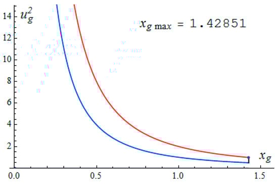 The blue line in the plane of parameters (Equation (36)) is the lower boundary of the area of existence of regular solutions with finite mass M. The denominator of (Equation (32)) is zero on the blue line. The red line is the upper limit. At , the total mass . (Equation (32)) is zero on the red line.
