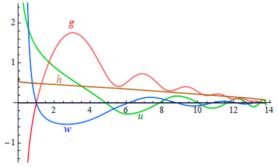 all four functions, , as well as their derivatives, are continuous at . In accordance with Equation (28), at . From Equations (25) and (27), we find