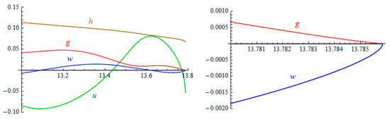 On the interval , the metric component . This is the region of changed signature. Its left (regular) boundary is . On the right boundary , the scalar field u(x) terminates with a non-zero value. On enlarged scales, this solution in the vicinity of the horizon is shown in Figure 3.