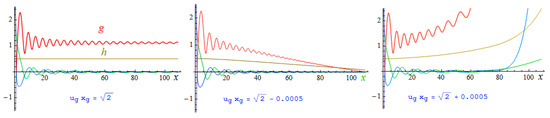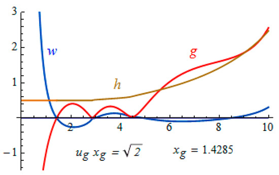 The band of existence of regular solutions in the plane () has a restriction from the right: This limitation is due to the fact that, at , the first left minimum of the red curve g(x) in Figure 5 touches the horizontal axis at the point x = 2.87. After that, g(x) remains positive and grows indefinitely with x.