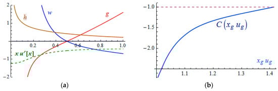 The wave function u(x) (green line) terminates at the horizon with a non-zero value and a root feature. In the very close vicinity of (Figure 3, right graph), one can see that w(x) (blue line) vanishes at in a square-root form.