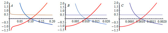 Red lines in graphs A, B, and C show that, with a decrease of (and a simultaneous increase of along the path in Equation (40)), the metric function gets closer to −1 in the center. Values of are 0.1 (A), 0.01 (B), and 0.001 (C). The blue line is , and the brown line is .