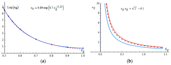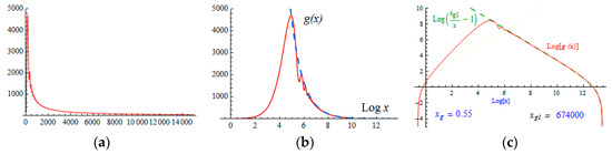 With these parameters, the horizon is It is much farther than the end of the horizontal axis in Figure 9a. In order to see how the part of the graph that “stuck” to the vertical axis looks like, the same function g(x) is presented in Figure 9b with a logarithmic scale along the x-axis. The dashed line in Figure 9b is the Schwarzschild’s asymptote outside the gravitating mass extrapolated back into the region of localization of the scalar field. The same graph g(x) is shown in Figure 9c with logarithmic scales along both axes. It clearly demonstrates the relationship between and .
