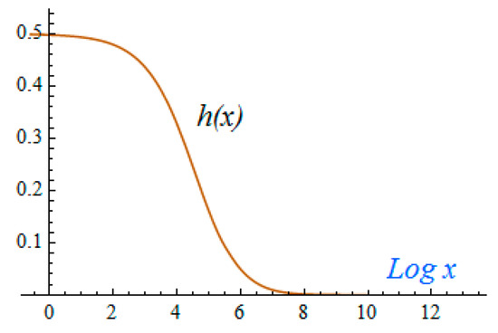 For a super-heavy black hole, the inequality >> is carried out with a huge margin. The function h(x) at is negligible in comparison with unity. One can see it in Figure 10. Energy–momentum tensors in Equations (21) and (46) have the same structure on the interface region. Only the wave function and the derivative are swapped, and masses of quanta are different. In dimensionless variables with as a unit of length,