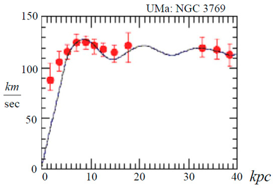 Figure 11 shows the rotation curve of the spiral galaxy NGC 3769 of the Ursa Major cluster [3,10]. Dots with error bars are observations, copied from Reference [11]. The solid curve is the analytical dependence of the velocity on the radius (Equation (67)).