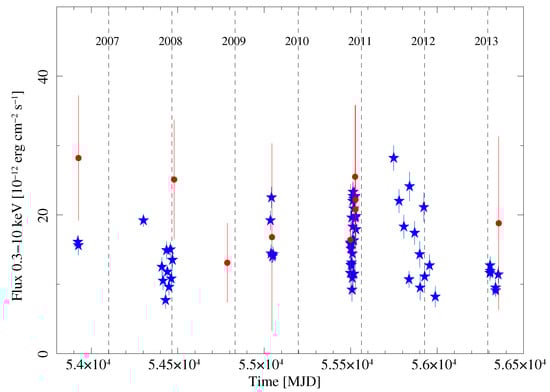 Swift/XRT light curve of J from the analysis reported by Foschini []. Blue stars indicate a best fit with a power-law model; red circles are for a broken power-law model. The vertical lines for the years are placed on 1 January of each year.