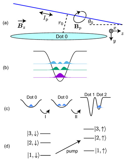 Figure 1a schematically shows the system under consideration, where two-dimensional electron gas is in the -plane. A stretched quantum dot (Dot 0) is located along the z-axis. We assume that the confinement of the electron in the y direction is at least twice tighter than the confinement in the z direction. Thus, the one-dimensional model can approximate a few of the lowest-energy eigenstates of the dot that we utilize. There is a time-independent uniform magnetic field along the z-axis. A conducting lead (blue line) carries the AC current, , which produces the pump magnetic field along the x-axis perpendicular to the two-dimensional electron gas. The conducting lead is separated from the center of Dot 0 by distance , and is tilted with respect to the z-axis by angle to introduce the spatial inhomogeneity of in Dot 0 [12], which is essential for our proposal, as shown in Equation (4). We assume that the initial condition of the electron trapped in Dot 0 is a superposition of the spin-up ground state and the spin-down ground state. The squared amplitudes of the wave functions of the three low-lying eigenstates for either spin-up or spin-down are shown in Figure 1b.