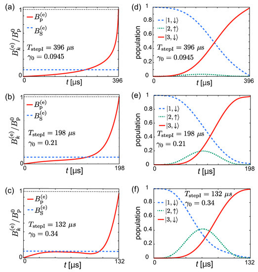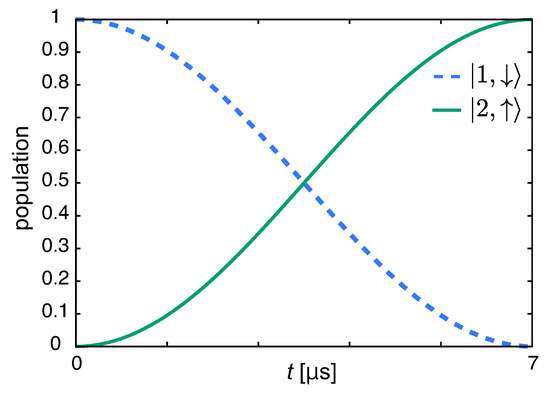 We assume that the initial state is which is equivalent to because at the initial time. The quantum adiabatic theorem states that if are changed slowly enough and the initial state is an eigenstate , the state remains in the same eigenstate during the control. Therefore, when increases sufficiently slowly, the population is gradually transferred from to [34,35]. We take so that at the final time. For , and are to be gradually decreased to zero. The population of each state () is approximately unchanged if the duration of this process is long enough and because the state remains in .