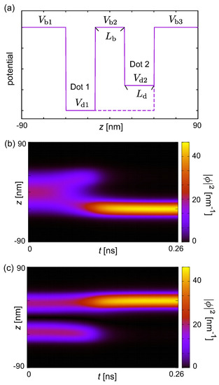 As the middle potential barrier, which divides Dot 0 into Dot 1 and Dot 2, is raised, and the potential depth of Dot 2 is tuned, the wave functions of the ground and the first excited states are transferred into Dot 1 and Dot 2, respectively. We use the one-dimensional model with the rectangular potentials illustrated in Figure 3a to simulate Step II. The potentials for dots are approximated by the rectangular ones for simplicity. Details of the potential profile do not affect the result because this step employs adiabatic dynamics. for and for denote the barrier heights and the potential depths of the dots, respectively. The widths of the dots and the widths of the barriers are all taken as 30 nm. At the initial time () of Step II, we take so that the two dots are combined to form a single larger dot (Dot 0). The middle barrier height and the dot potential depth are adiabatically ramped from 0 to and , respectively, as