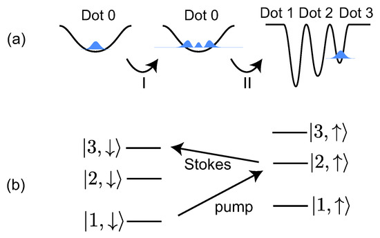 (a) Schematic description of the spin-selective single electron transfer. The black curves show the potential profiles of the quantum dot(s). The blue color represents the squared amplitude of the wave function of an electron whose initial spin was down. (b) Energy diagram of the system in Step I. The AC magnetic field (pump field) couples and , while (Stokes field) couples and .