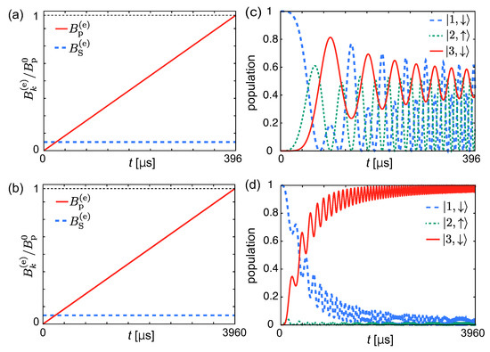 Figure 5 shows the time dependence of the envelope functions and (Figure 5a,b) and the corresponding time dependence of the population of each state (Figure 5c,d). We use mT and mT so that the maximum value of is the same as the one used in -pulse control and at . In the control with s, the state deviates from due to unwanted nonadiabatic population transfer. Thus, the population of at is less than 0.5. On the other hand, the dynamics are approximated by , and the population of is approximately 0.95 at for s. However, required for the adiabatic dynamics is too long, in which case the efficiency will be degraded by relaxation and decoherence in actual experiments.
