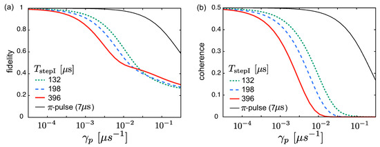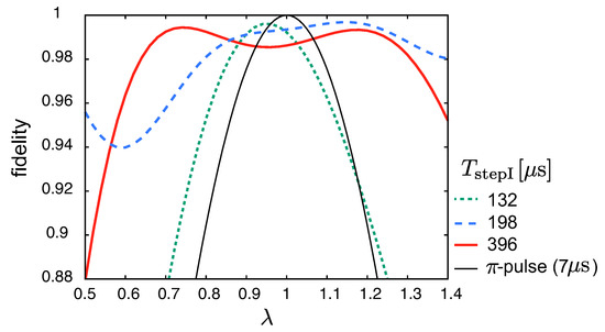respectively. Note that the state is transferred to in the -pulse case without decoherence. On the other hand, the state is transferred to in the invariant-based engineering protocol if there is no decoherence. The phases of in Equation (26) and in Equation (27) appear after the controls without decoherence. We define the fidelity, F, of the controls as
