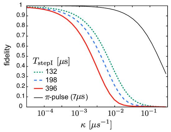 Figure 8 shows the fidelity of the -pulse control and the invariant-based engineering protocol as a function of . It is seen that the -pulse control is much more robust against the relaxation than the invariant-based engineering protocol because its control duration is much shorter than the one for the invariant-based engineering protocol.