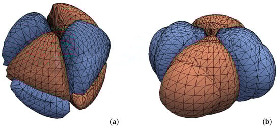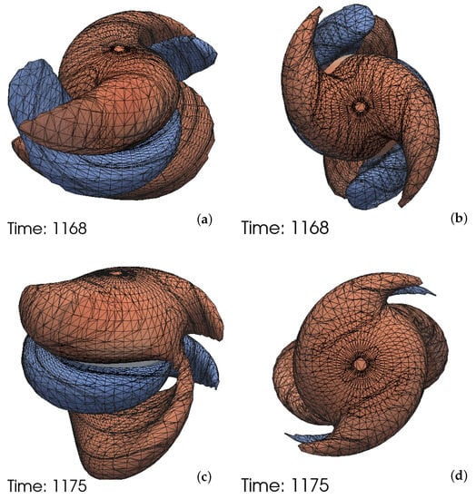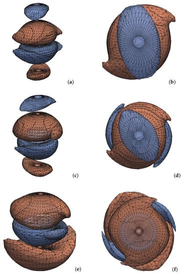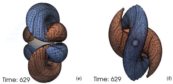 The analytically constructed contours of opposite vorticity (plotted by coding the relevant equations mentioned below into the numerical grid—no actual simulation took place, the data are from direct evaluations of analytical expressions; the reason for doing so is to take advantage of the powerful visualization software Paraview [], and this approach should not introduce excessive numerical noises since the expressions are smooth and thus pose no challenge to spectral representations). (a,b): Two contours of opposite vorticity from the mass quadrupole (Equation (5)) plus a current dipole. The contours, in particular the spiraling arms, are aligned with each other across the orbital plane. (c,d): Similar contours from the current quadrupole (Equation (7)) plus the dipole. The contours are misaligned by , and obey skew-reflection antisymmetry. (e,f): Both current and mass quadrupoles are included in addition to the dipole. The contours are misaligned by an angle between 0 and , breaking both reflection and skew-reflection antisymmetry. Left column: Side views of the contours (not at the same angle). Right column: Top views (looking down ) of the contours.