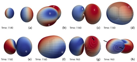 The situation is different when we compare the predicted and the numerically computed , as the latter lacks the steep rise just before merger that is also seen in spin patches. To understand this, recall that the numerical spin values are calculated as integral Equation (26). Such an integration over the entire horizon does not distinguish the spin patches like C and G in Figure 5c,e from the mass quadrupole induced patches A and B as in Figure 5c. As the mass quadrupole patches on each apparent horizon resembles a spin pointing in the direction at merger time (see Figure 5c,e,g,h), the numerical spin measurement according to Equation (26) could be negative even when the post-Newtonian equivalent spin is positive. On the other hand, the measurements on and are less affected by this contamination. Furthermore, it is required that the first derivative of the scalar in Equation (26) should be a rotation generating approximate Killing vector [,,,], which may not be applicable when we approach the highly non-stationary merger phase.