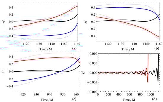 Strictly speaking, the difference between and can become substantial near merger, and since it is the latter that we extract from simulations, Equations (22) and (25) can not provide useful simple intuitions regarding the spin dynamics. Indeed, since radiation reaction becomes significant in that regime, the quantitative correctness of these conservative expressions is not guaranteed in the first place (precise analytical expressions are not available for the merger phase, which is one of the reasons why numerical simulations are indispensable). The reason why we evoke these next-to-leading order expressions at all is merely because they demonstrate the qualitative behaviour that the effective can have a sign reversal, making alignment a viable local energy minimum. Throwing away the crutch of perturbative expressions, we really only need the qualitative statements, that the spin– near-alignment or near-anti-alignment configurations are energetically favorable for the spin–orbit coupling, and that mechanisms like the spin–spin coupling exist that can lift the spins out of the orbital plane (see e.g., [,] and Figure 5 of [] for other studies of this effect in the superkick context), to remain true in the strong field regime. The perturbative expressions have hinted that it may be possible to meet these requirements, but strong field expressions are needed for quantitative assessments.