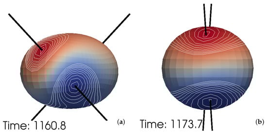 where is the area element on the horizon, and for the event horizons, is plus some spin coefficient corrections that vanish in a stationary limit (see References [,]). We will use the apparent horizons in this paper, which coincide with the event horizons in the stationary limit [], but are not teleological and therefore more widely utilized in numerical simulations. The quantity in Equation (26) is determined by an eigenvalue problem on the horizon, and is essentially an spherical harmonic []. In other words, the spin is given by the dipole part of the horizon vorticity . For example, during early inspiral, the pattern on each individual horizon is dominated by the spin of that black hole, forming a dipolar shape like those seen for the Kerr black holes in Reference []. This is shown in Figure 5a, and can be used to identify the spin directions.