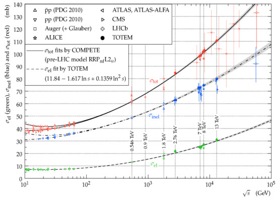 - Aspell, P.; Atanassov, I.; Avati, V.; Baechler, J.; Barrera, C.B.; Berardi, V.; Berretti, M.; Bossini, E.; Bottigli, U.; Bozzo, M.; et al. [The TOTEM Collaboration] First measurement of elastic, inelastic and total cross-section at = 13 TeV by TOTEM and overview of cross-section data at LHC energies. arXiv 2017, arXiv:1712.06153. [Google Scholar]