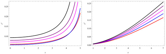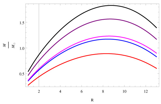 (iii) Since , in Figure 5 so one can notice that the mass function is regular at the origin. From this mass–radius relationship, we also note a striking feature which depicts that with increasing value of radius the mass of the physical system also increases and beyond km mass starts gradually decreasing. Thus, we observe a stable configuration of strange stars around 12 km, beyond which it suffers from instability. Moreover, we observe that in contrast to the GR case the curve allows for a massive quark star at the same radius.