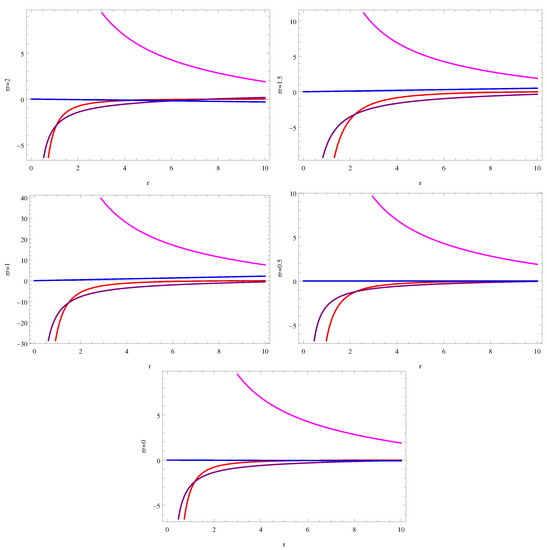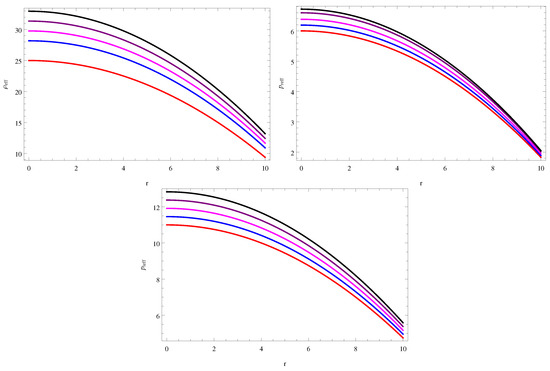 Plot of , and versus r for the strange star candidate . The red, purple, magenta, blue and black colors represent, respectively, cases .