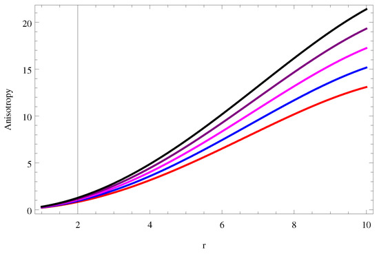 Plot of anisotropy versus r for the strange star candidate . The red, purple, magenta, blue and black colors represent respectively cases .