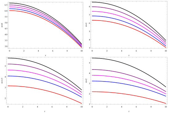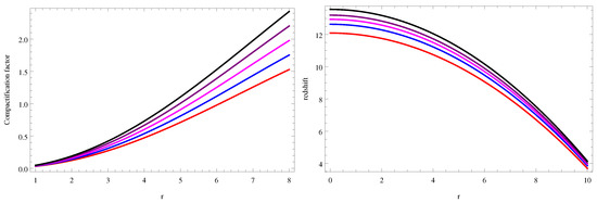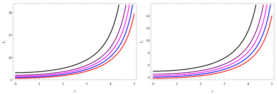 The adiabatic index is a crucial feature to investigate regarding the stable status of an anisotropic fluid star model. It has been proposed that the radial adiabatic index should be greater than , which represents the rigidity of the EOS parameter of the model [116,117,118,119]. The radial adiabatic index is defined as