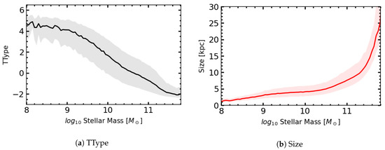 (a) Morphological type (TType) and (b) Size vs. Stellar Mass relations within the SDSS, used to assign the respective parameters to the catalogue. The shaded regions show the 1s uncertainty in these parameters.