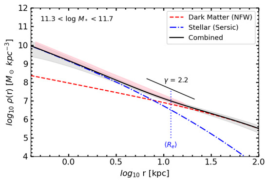 A simple validation to show that these components are “working together” as expected is shown in Figure 3, where we show the average predicted 3D mass density profile for elliptical galaxies of stellar mass . Each elliptical galaxy in this mass range is additionally assigned a Sérsic index (again according to the mean relation in the SDSS), a de-projected stellar mass density profile according to the prescription of [23], and an NFW profile [24] with halo concentrations according to the model of [25]. Finally, the average mass density per bin of radius is calculated for the sample. This result is compared to the pure power law model of [26], where at , derived from 2D stellar kinematics and strong lensing measurements. Specifically, ref. [26] inferred that , valid in the range to and . This result is shown as the pink stripe in Figure 3, showing good agreement with the model at . The slopes at low radii were found to be very sensitive to the definition of , in this case showing a slight divergence from the data.