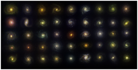 Composite images of 45 spiral galaxies extracted from the SDSS, processed to be visually pleasing.