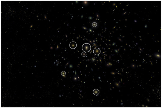A cluster of galaxies within Astera, where the large elliptical galaxies have been circled. The elliptical galaxies preferentially occupy the centre of the cluster, in line with observations.