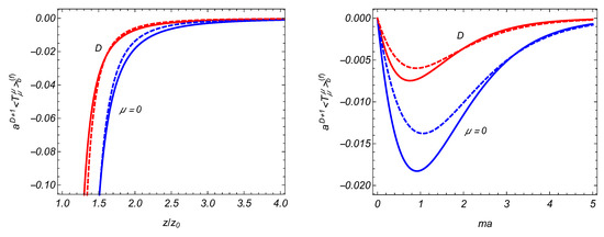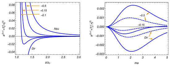 The left panel of Figure 1 presents the dependence of the brane-induced contributions to the energy density and the normal stress (in units of ), (no summation over ), , on the ratio for fixed value . In the right panel, we display the brane-induced parts as functions of the field mass for fixed . For both panels, the full and dashed curves correspond to and , respectively.