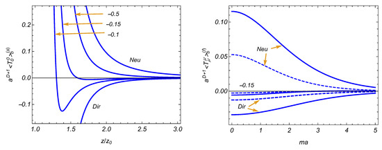 Note that we could also have modes with purely imaginary , . For those modes, , where is the MacDonald function (the modes with the modified Bessel function are not normalizable). From the boundary condition (9), we get the equation for the allowed values of : . The energy corresponding to these modes is given by and it becomes imaginary for . This leads to the instability of the vacuum state. To exclude the unstable modes, we restrict the allowed values for the Robin coefficient in the region where the equation has no roots. It can be seen that, for non-Dirichlet boundary conditions (), the corresponding condition is expressed as (for more detailed discussion in models with compact dimensions, see [72]). For there is a single root. For the special value , there exists a mode with and with the mode functions . For a minimally coupled massless scalar field, one has and this special value corresponds to the Neumann boundary condition. The corresponding mode functions do not depend on z.