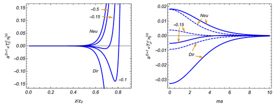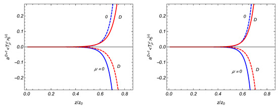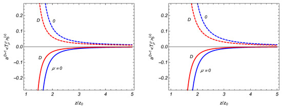 The general formula (49) for the brane-induced contribution in the energy–momentum tensor is simplified in the region near the brane and at large distances from it (near-horizon limit). For large values x, the integrand in (49) behaves as , and the integral is divergent for points on the brane. These surface divergences are well-known in quantum field theory with boundaries and have been widely discussed in the literature for different geometries of boundaries (see, for instance, [8,9,10,11]). Near the brane, assuming that , the contribution of large values of x dominate in the integral, and, by making use of the corresponding asymptotic formulas for the modified Bessel functions, in the leading order, we obtain