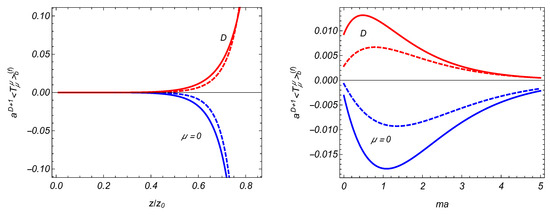 The brane-induced contributions in the VEVs of the energy density and the normal stress as functions: of (left); and of (right). For the left panel, we take and for the right panel . The full and dashed curves correspond to and .