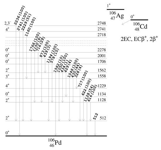- De Frenne, D.; Negret, A. Nuclear data sheets for A = 106. Nucl. Data Sheets 2008, 109, 943–1102. [Google Scholar] [CrossRef]