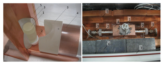 Left photograph: the CdWO crystal scintillator (1), Teflon support of the CdWO crystal (2), CdWO crystal scintillators (3), quartz light-guide (4), “internal copper” brick (5). Right photograph: the detector system installed in the passive shield: PMT of the CdWO detector (1), light-guides of the CdWO counters wrapped by reflecting foil (2), PMT of the CdWO counters (3), “internal copper” bricks (4), “external copper” bricks (5), lead bricks (6), and polyethylene shield (7). The copper, lead and polyethylene shields are not completed.