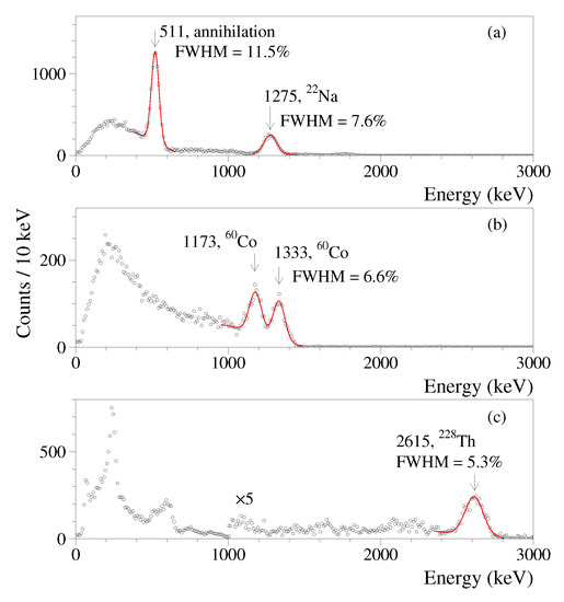 The energy resolution of the CdWO detector for the total exposure can be described by the function , where FWHM (full width at half maximum) and are given in keV. The poor energy resolution of the enriched detector (despite excellent optical properties of the material [32]) is caused by the elongated shape of the enriched scintillator that results in a rather low and non-uniform light collection, and by the using of not perfectly transparent PbWO crystal light-guide. The performance of the CdWO counters is substantially better. The energy spectra that were accumulated by one of the counters with Na, Co and Th sources are presented in Figure 4. The energy resolution of the counters was estimated by using the results of the three energy calibration campaigns as with the coefficient a equal to 2.97 and 3.13 for the two detectors. The resolution formulas also take into account energy scale shifts during the data taking over the experiment.