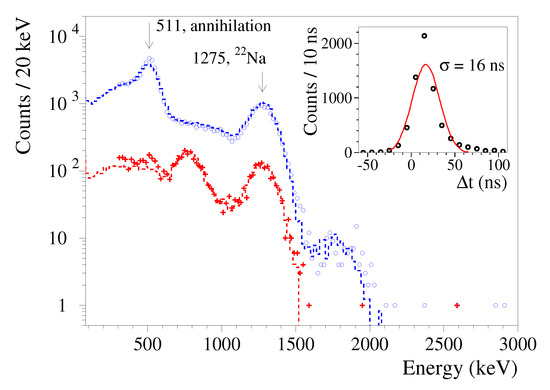 Energy spectra of Na quanta measured by the CdWO detector: with no coincidence cuts (blue circles) and in coincidence with energy 511 keV in at least one of the CdWO counters (red crosses). The data simulated by using the EGSnrc Monte Carlo code are drawn by dashed lines. (Inset) Distribution of the CdWO detector pulses start positions relative to the CdWO signals with the energy 511 keV.