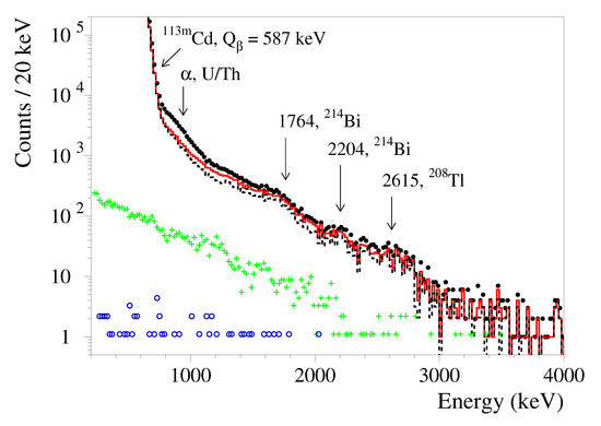 Energy spectra measured by the CdWO detector for 26,033 h in the low-background set-up without selection cuts (black dots), after selection of and events by PSD using the mean time method (solid red line), the and events in anti-coincidence with the CdWO counters (dashed black line), the and events in coincidence with event(s) in at least one of the CdWO counters with the energy keV (green crosses), the , and events in coincidence with events in both the CdWO counters with the energy keV (blue circles).