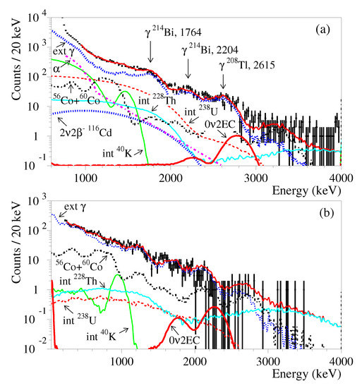 Energy spectra of the and events accumulated for 26,033 h by the CdWO scintillation detector in anti-coincidence with the CdWO counters (a) and in coincidence with the 511 keV annihilation quanta in at least one of the CdWO counters (b) (points) together with the background model (red line). The main components of the background are shown: the distributions of internal contaminations (“int K”, “int Th”, and “int U”) and external quanta (“ext ”), residual particles in the CdWO crystal (), cosmogenic Co and Co in the copper shield details, and the decay of Cd. The excluded distributions of the EC decay of Cd to the ground state of Pd with the half-life yr are shown by red solid line.
