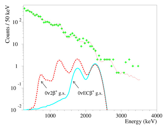 The sensitivity of the experiments in the search for “double beta plus” processes: double electron capture (2EC), electron capture with positron emission (EC), and double positron decay () is substantially lower, while the physical lepton-number violating mechanisms of the neutrinoless 2EC, EC and processes are considered to be essentially the same as for the decay with electrons emission. At the same time, there is a motivation to search for the EC and decays owing to the potential to clarify the possible contribution of the right-handed currents to the decay rate [10], and an interesting possibility of a resonant 2EC process [11,12,13,14].