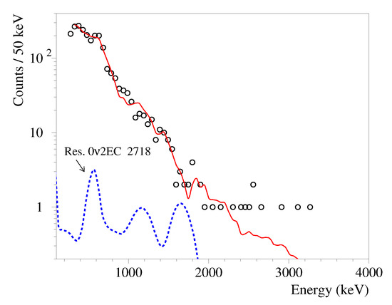 Energy spectrum of and events measured by the CdWO detector for 26,033 h in coincidence with event(s) in at least one of the CdWO counters in the energy interval ) − () keV (circles) and its fit by the model of background (red line). The excluded distribution of a possible resonant EC decay of Cd to the 2718 keV excited level of Pd with the half-life yr is shown.